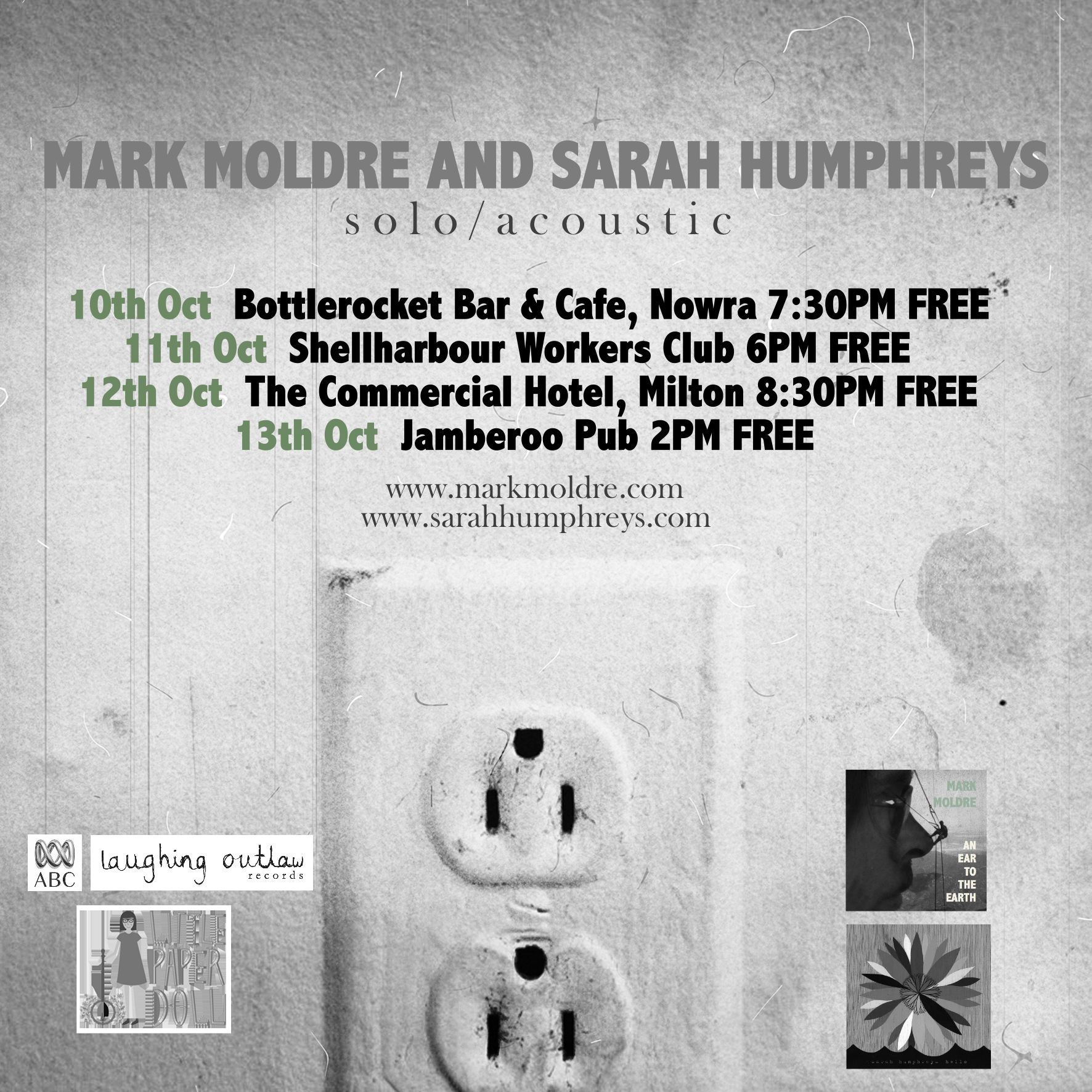 Well, after Mark’s Ballarat/Canberra/Melbourne jaunt he’ll be picking up his guitar again – this time to hit the NSW Southern Coast – with fellow Central Coast songstress (and close friend) Sarah Humphreys. They’ll be playing four back to back shows – solo and acoustic – in Nowra, Shellharbour, Milton and Jamberoo. All the shows are free entry. Just before they head off Mark will play a solo set on Wednesday Oct 2nd at A Walk In The Park – an event to raise awareness for mental health issues.