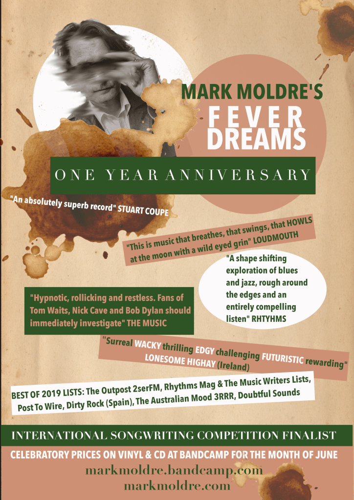During these difficult times and the Stage 3 lockdown in Australia I’ve been recording a few off the cuff, warts and all, hushed, one-take video cover versions on my phone. Songs by some of the artists that have inspired me the most over the years – so far you’ll find covers of songs by Jeff Tweedy, Neil Young, Howe Gelb, Tom Waits, Ron Sexsmith, Elliot Smith, McCartney and more. I’ve just thrown a few of them up on YouTube – though you’ll find the bulk of them on IGTV @markmoldre and Facebook. Below is a version of Ron Sexsmith’s “Pretty Little Cemetery” – which even prompted an unsolicited comment from Ron himself, (“Wow, beautiful job!”) it’s the small things that make all this music malarkey worthwhile.