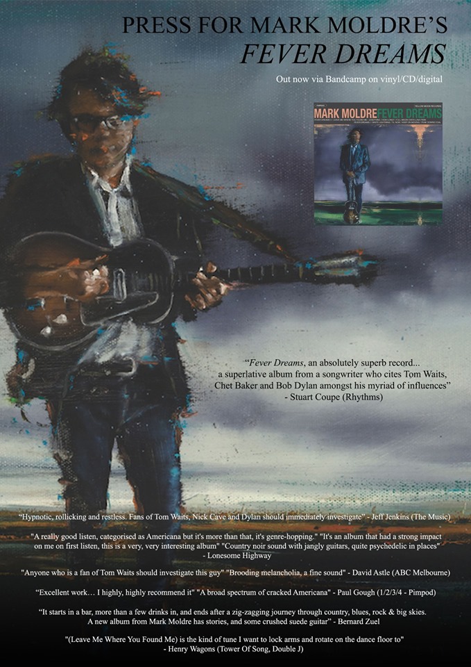 “It starts in a bar, more than a few drinks in, and ends after a zig-zagging journey through country, blues, rock & big skies. A new album from Mark Moldre has stories, and some crushed suede guitar”